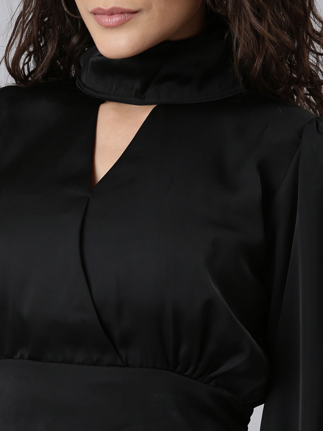 Women's Black High Neck Cuffed Sleeves Cut-Outs Blouson Crop Top