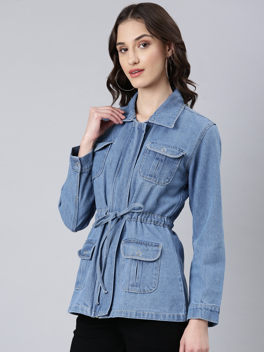 This Women Blue Solid Denim Jacket is not just a wardrobe essential; it's a fashion statement. Its timeless design allows you to effortlessly layer it over any outfit. providing warmth and style. Whether you're heading out for coffee with friends or attending a casual event. this jacket ensures you always look put together.