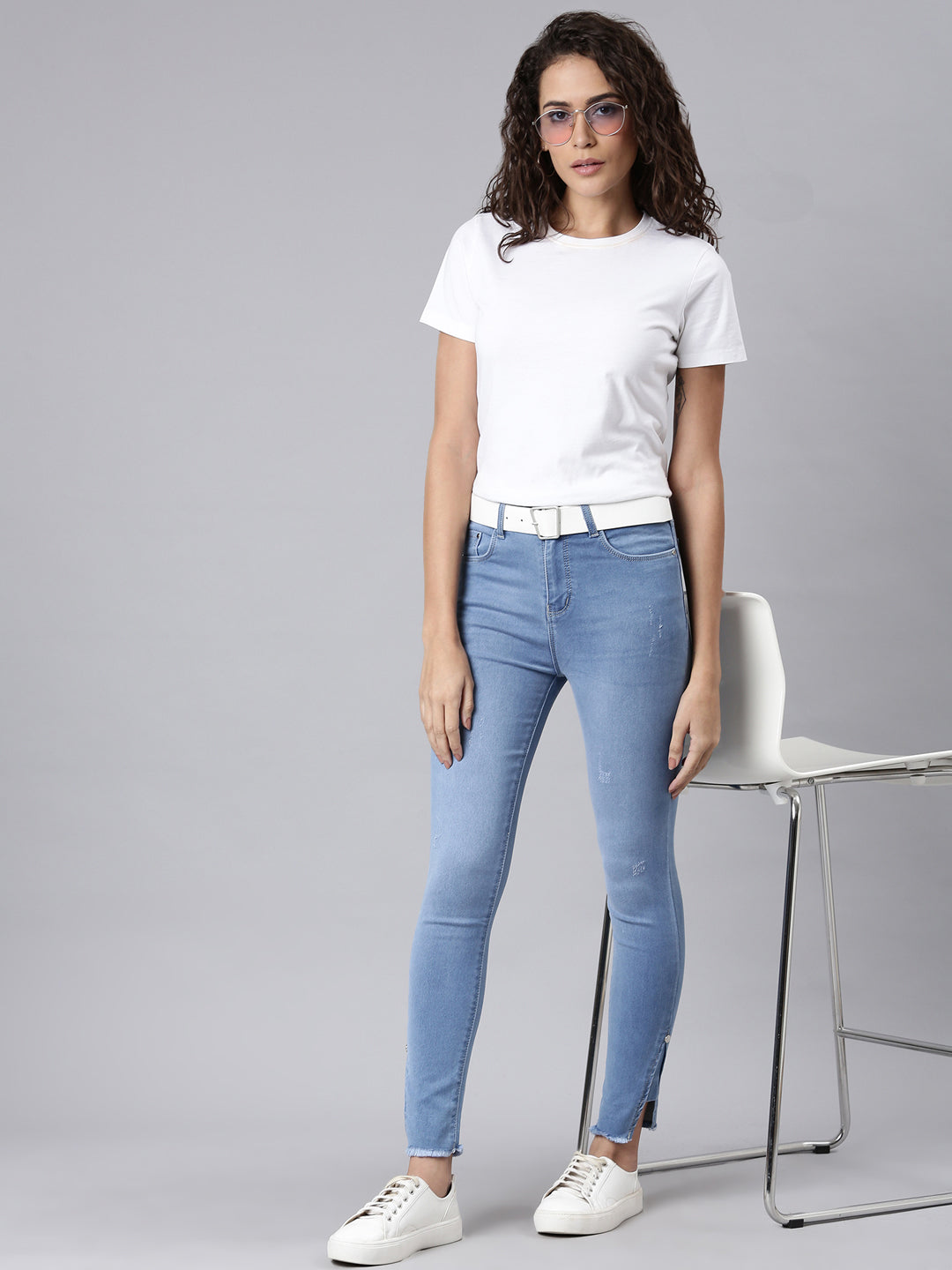 Experience comfort and style with our Women Blue Solid Skinny Fit Denim Jeans. designed to flatter your figure while providing ultimate flexibility for all-day wear. Perfect for casual outings or dressed-up occasions. these jeans are a must-have addition to your wardrobe.
