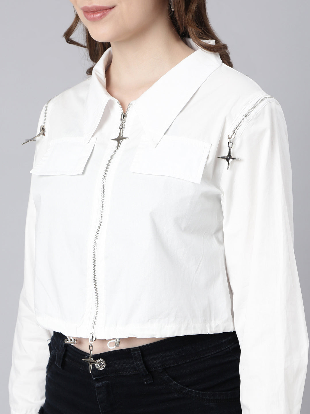 Elevate your autumn wardrobe with our Women's White Spread Collar Cotton Crop Tailored Jacket. This chic piece combines style and functionality. making it an essential addition to your western wear collection. Crafted from a high-quality cotton blend. this tailored jacket features a stylish spread collar and zip detail. ensuring you stay fashionable and comfortable.
