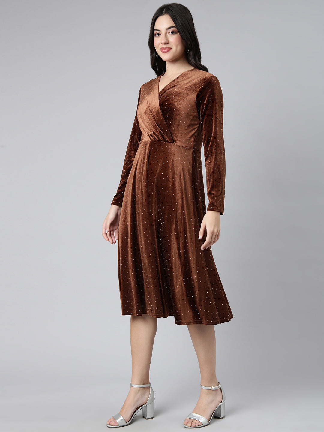 Discover elegance with our Women Embellished Brown A-Line Dress. designed to make you the center of attention at any event. This stunning dress boasts intricate embellishments that catch the light beautifully. ensuring you shine wherever you go.
