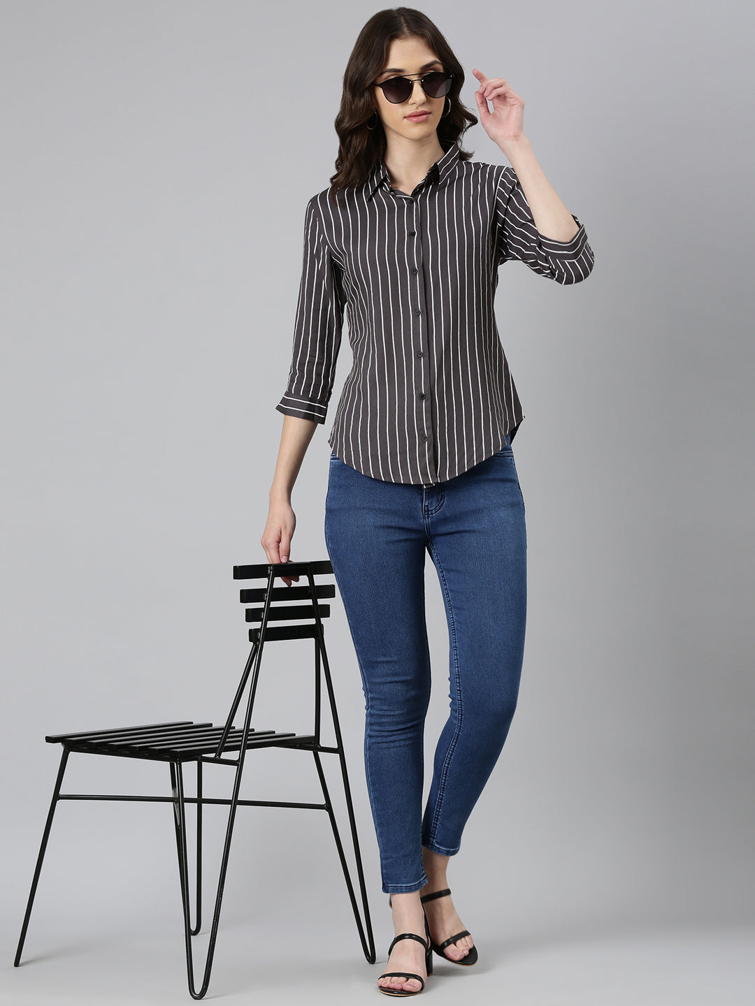 Women's Grey Standard Slim Fit Vertical Striped Casual Shirt