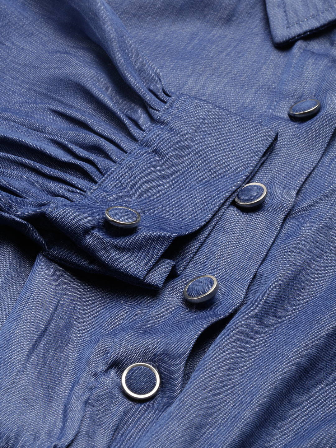Women's Navy Blue Shirt Collar Cuffed Sleeves Smocked Cotton Shirt Style Crop Top