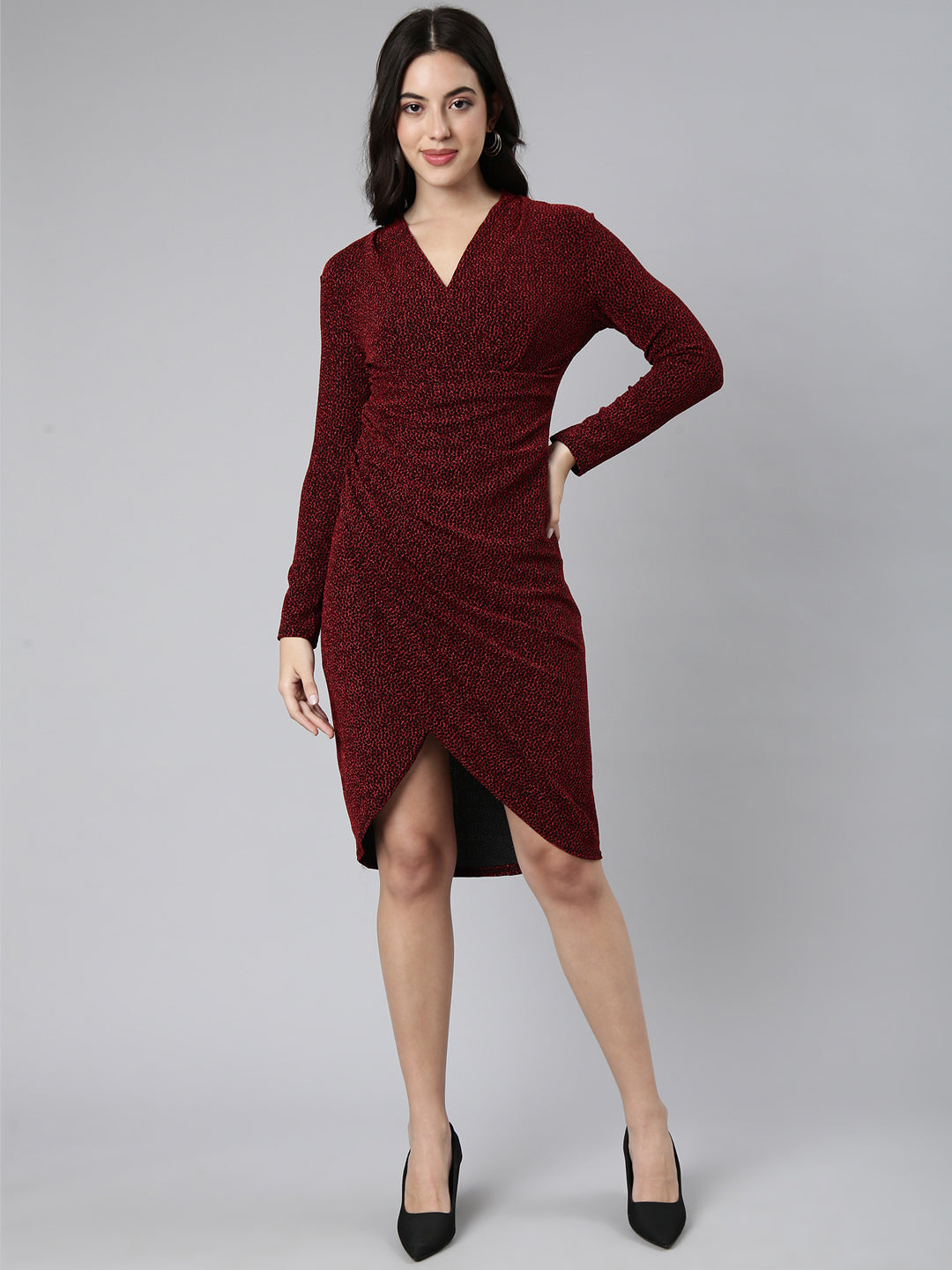 This dress is not just a piece of clothing; it's a statement. The self-design gives it an exclusive touch. ensuring you stand out in any crowd. Its flattering fit and timeless color make it an essential addition to your closet. suitable for various occasions. from office meetings to evening parties.