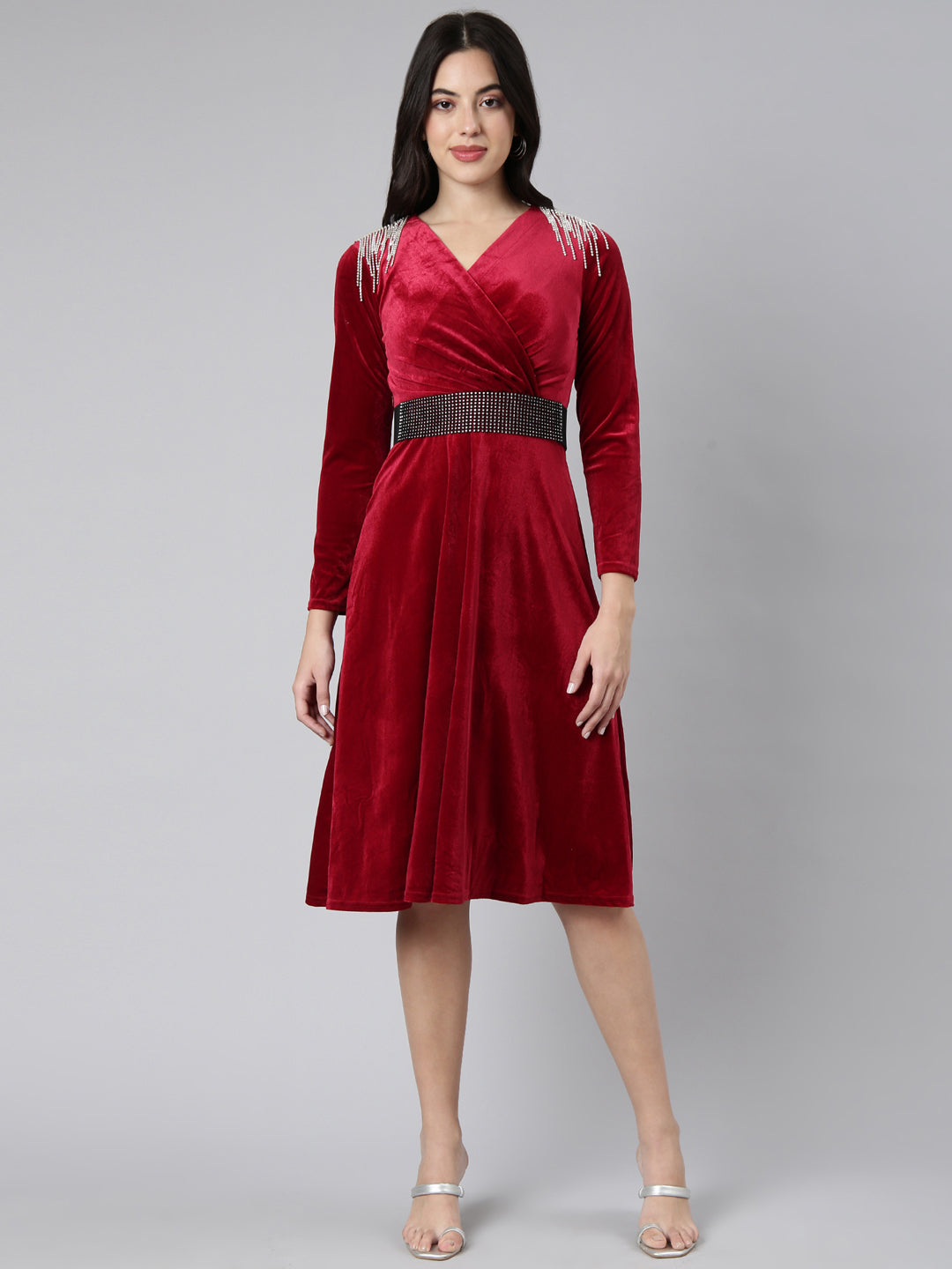 Step out in style with our Women's Solid Burgundy Fit and Flare Dress with Belt. a stunning addition to your wardrobe. This fit and flare design features a flattering silhouette. perfect for spring and summer events. Crafted from luxurious velvet. it ensures comfort while making a fashion statement. The embellished detailing and knee-length cut add an elegant touch. making it ideal for parties or casual outings.