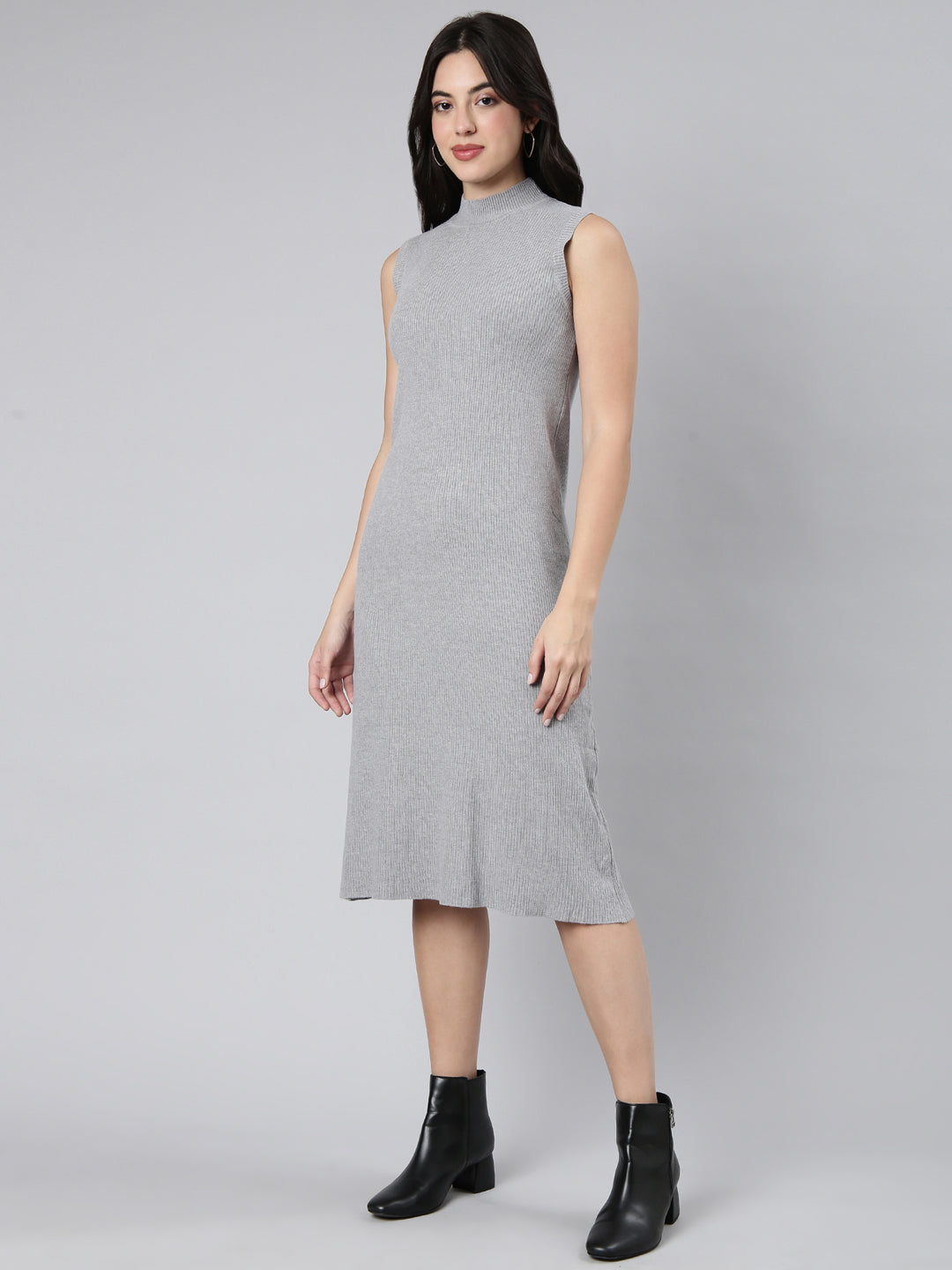 Elevate your wardrobe with the Women Solid Grey A-Line Dress. a perfect blend of elegance and comfort that effortlessly transitions from day to night.