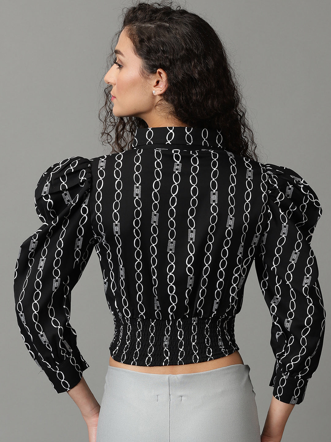 Women's Black Geometric Printed Puff Sleeves Shirt Style Smocked Top