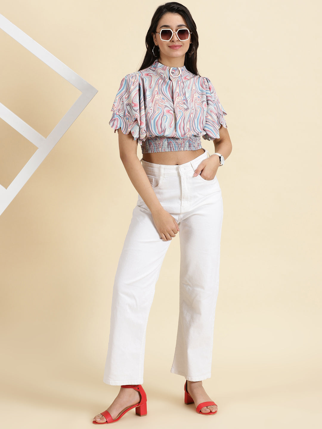 Women's Multi Printed High Neck Collar Flutter Sleeve Crepe Blouson Crop Top