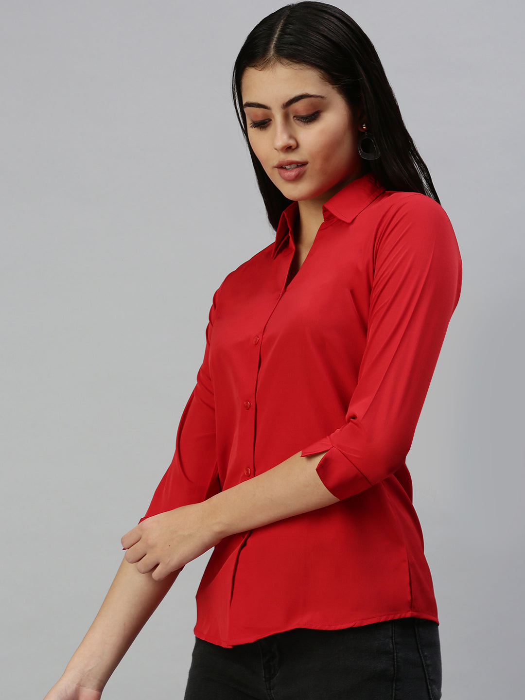 This solid red shirt stands out in the competitive world of women's topwear due to its versatility and timeless design. Ideal for autumn and spring seasons. it effortlessly transitions from the office to casual outings. With discounts of up to 75% off. it's a steal for quality and style!