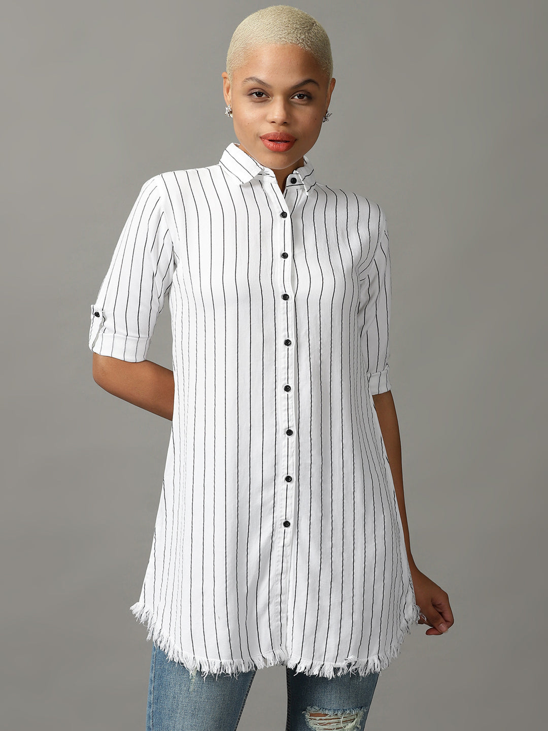 This Women's White Striped Longline Shirt is the perfect blend of style and comfort. designed for the modern woman who values both fashion and functionality. With its chic longline silhouette and timeless striped pattern. it effortlessly elevates any outfit.